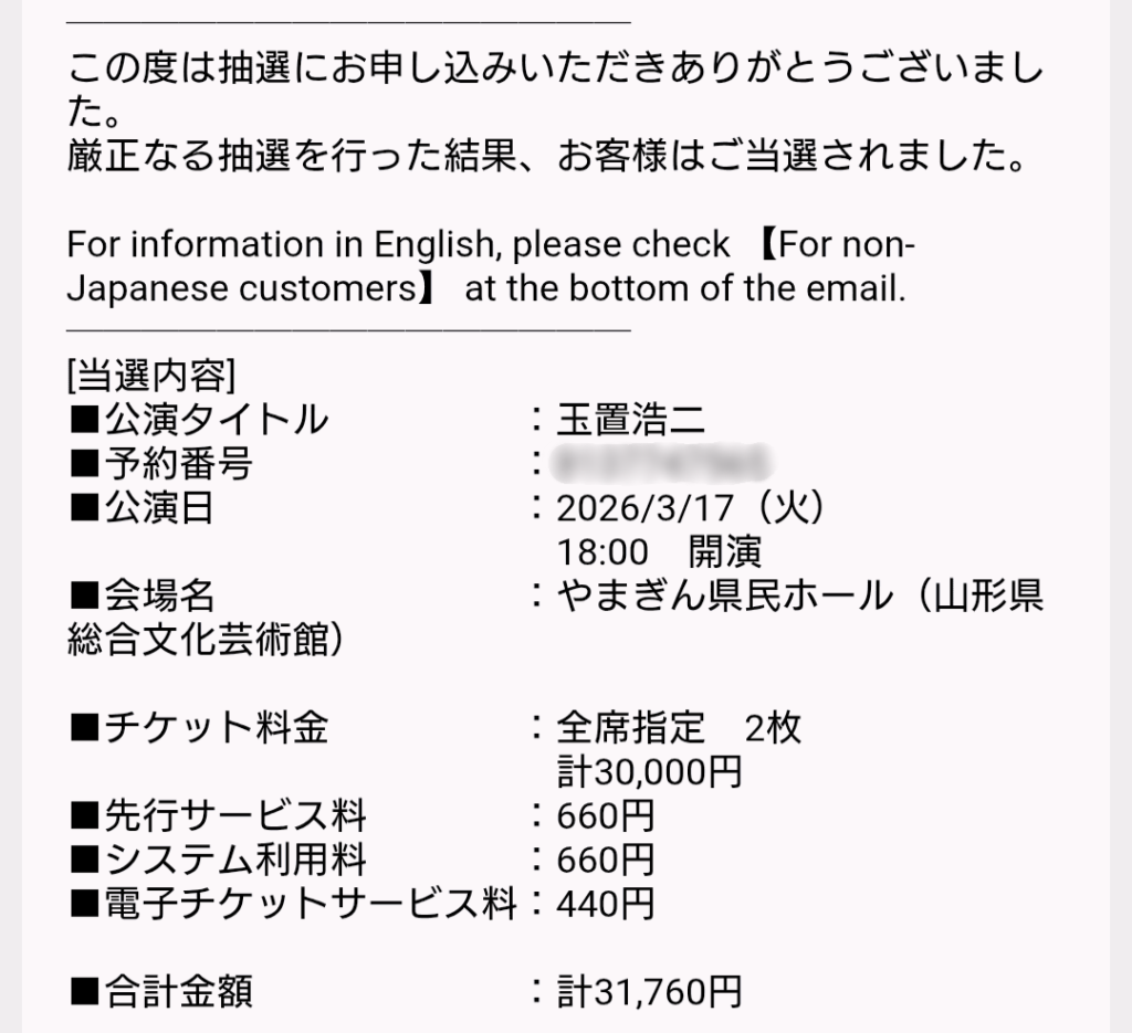 当落発表は2025年11月21日(金)でしたが、メールがくる前にクレジットカードの引き落とし通知で当選したことに気付きました笑笑